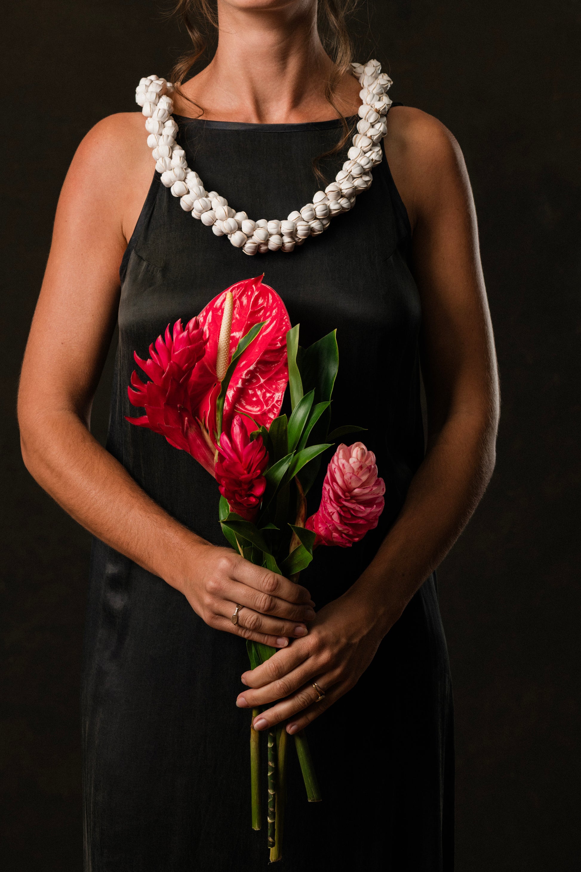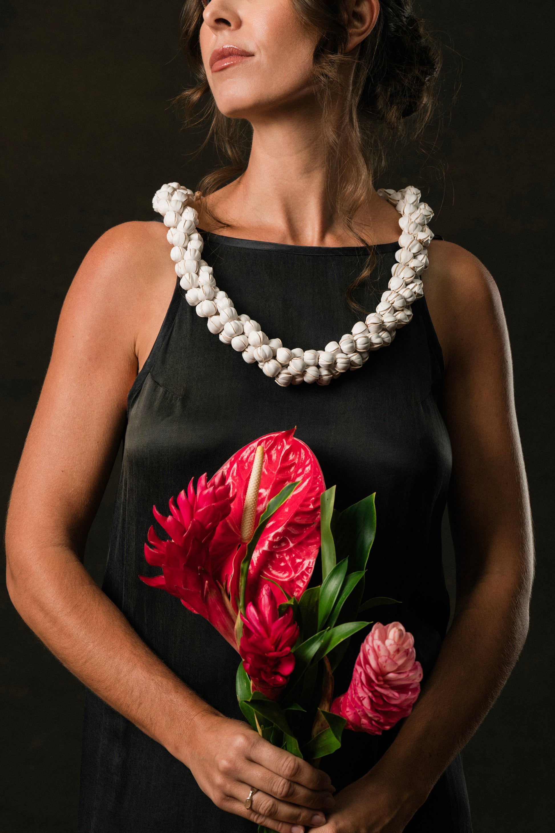 This lei is carefully created by hand, with each flower bud designed with two hand molded flowers, nestled into one another and delicately textured to give it's unique design honoring the pikake flower. Our lei is strung on beautiful silk ribbon hand dyed from natural materials right here from Hawai'i by the talented Okbet Supply- Kristin Baucom. Three individual strands stretching 36" long are woven in a twist to for it's signature look.